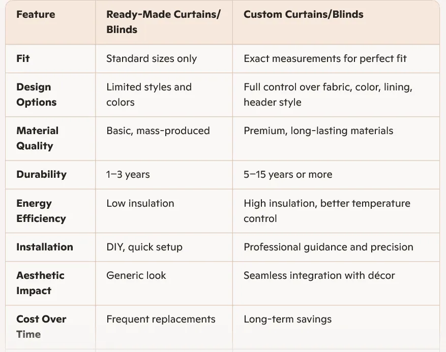 TL;DR: Ready-made curtains and blinds are quick and affordable, but they often fall short on fit, style, and durability in the long run.
