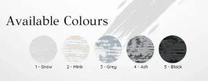 Popular samples include Milan (Snow, Mink, Ash) for pared‑back rooms and Amsterdam or Boston varieties (White, Ivory, Gold, Duck Egg, Grey) for gentler palettes.